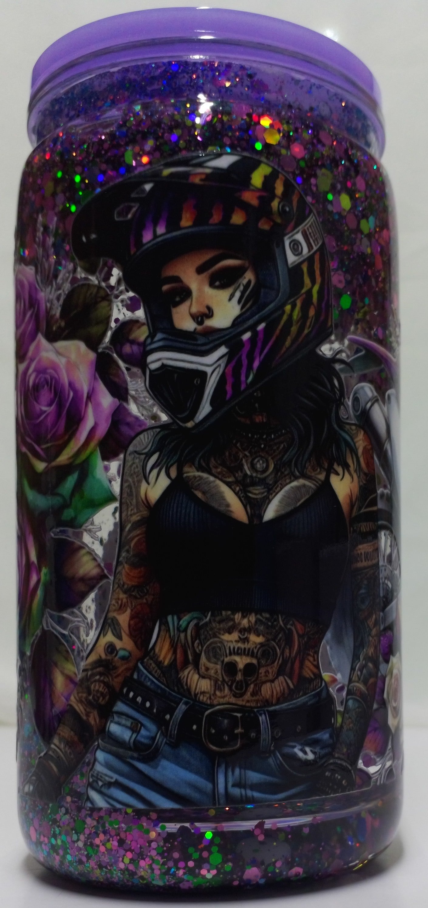 This 16 oz plastic snow globe cup features a vibrant "Girl on a Dirt Bike" design and a colorful lid, making it a fun and practical choice for staying hydrated on the go. Its durable construction ensures it can handle everyday use, while the eye-catching design adds a playful touch to your drinkware collection. Perfect for dirt bike enthusiasts or anyone who loves unique, spirited accessories.