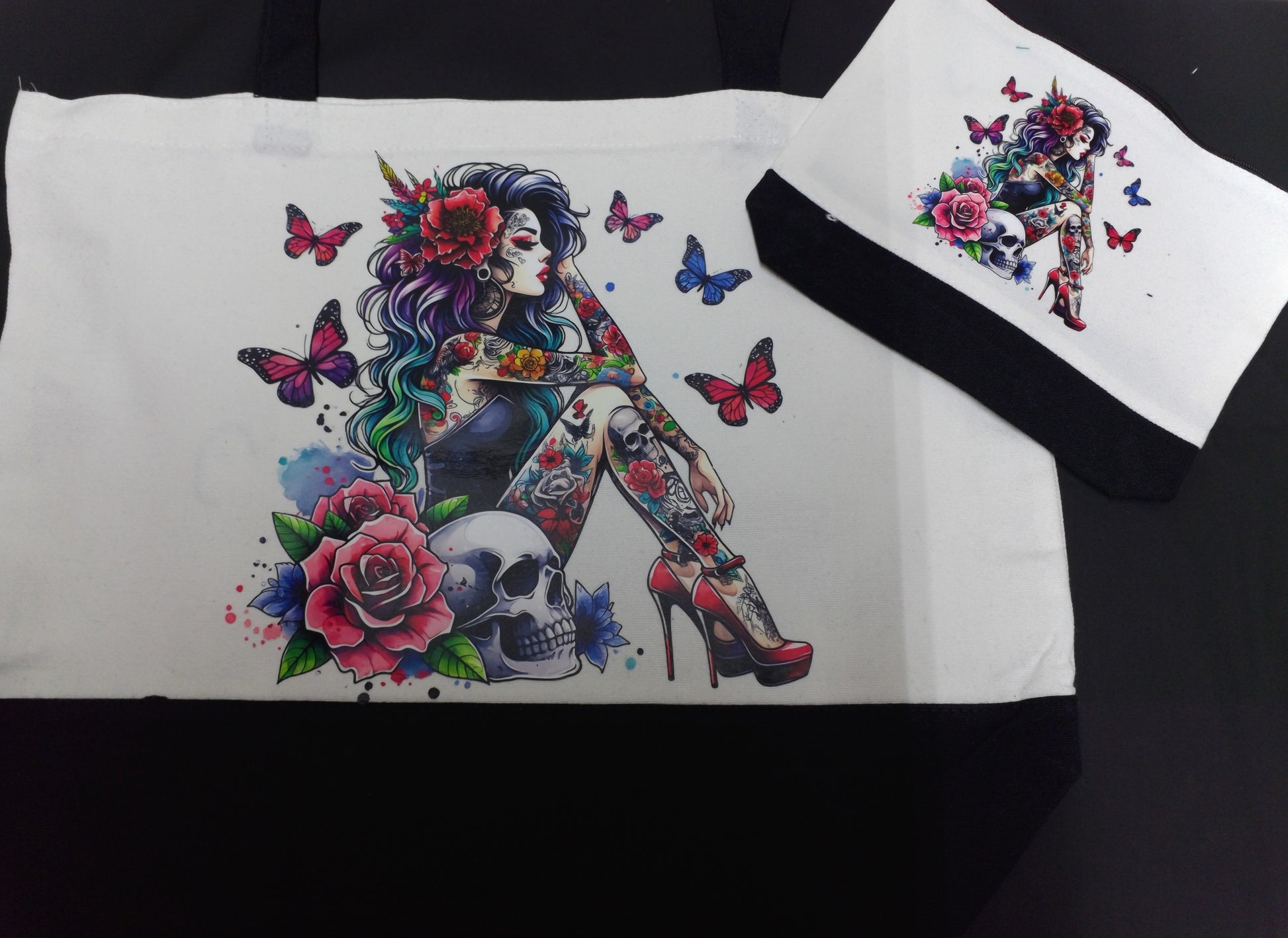 Woman with tattoos an skull matching bag set